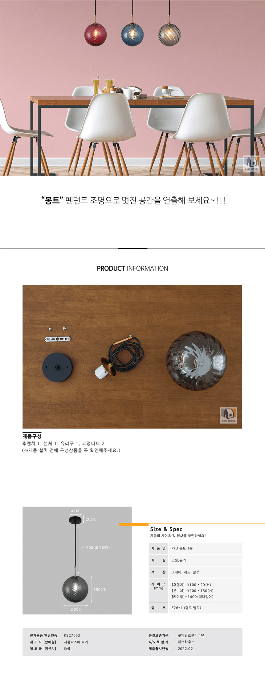 LED 무드등 펜던트조명 몽트 1등 B2B