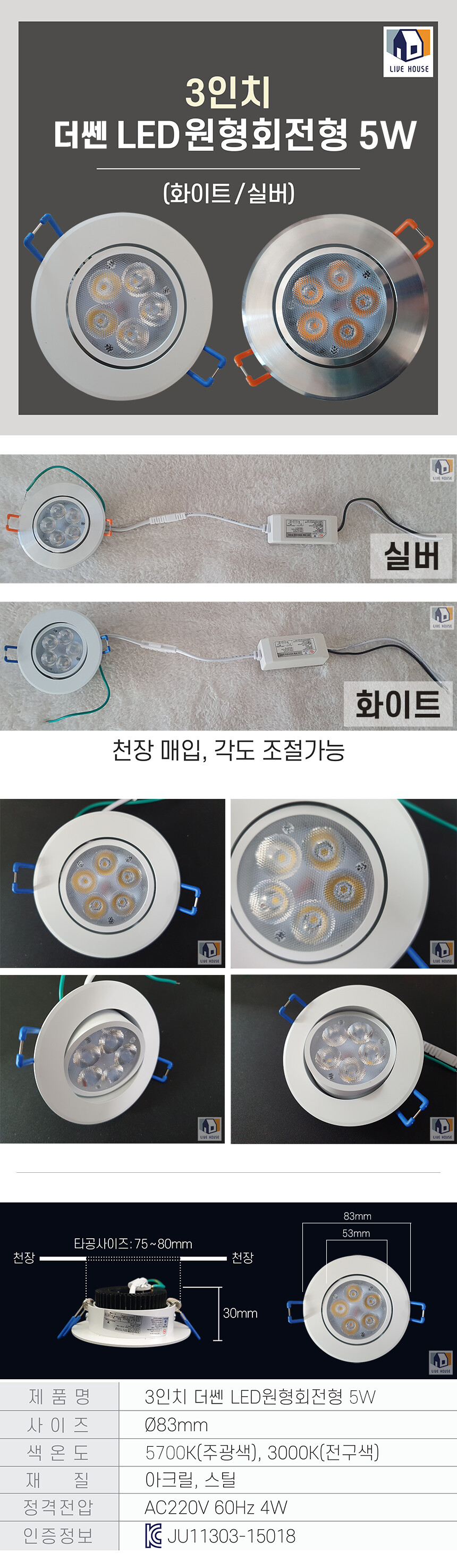 더쎈 LED 원형 일체형 매입등 직회전 다운라이트 3인치