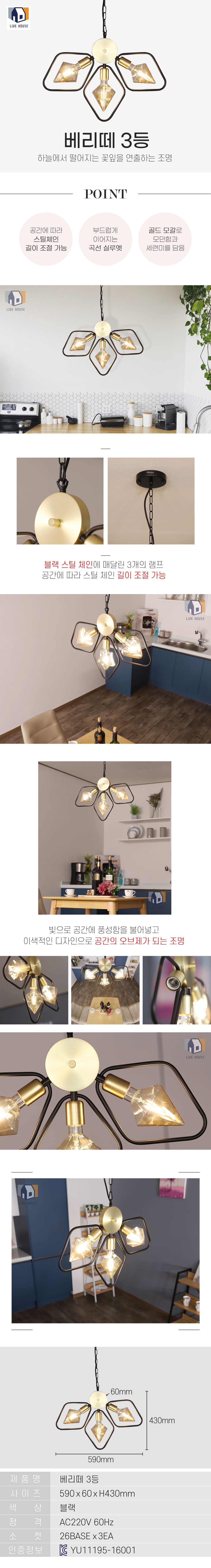 베리떼 3등 LED 포인트 북유럽 식탁등 펜던트 카페 조명 전등