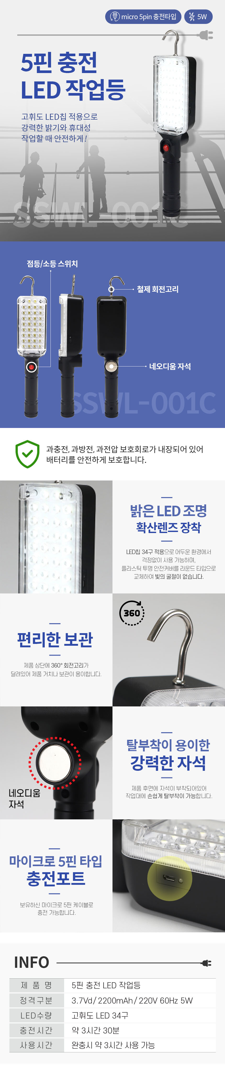 5핀 충전식 LED 작업등 캠핑 랜턴 다용도 현장 야외 자석 걸이 조명