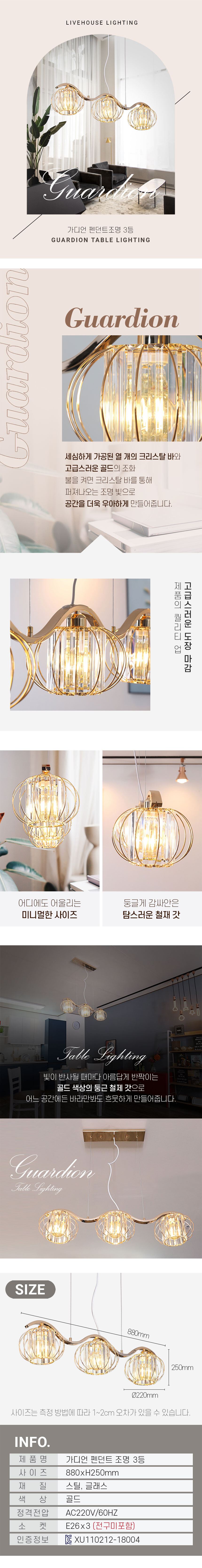 가디언 3등 인테리어 LED 펜던트 크리스탈 식탁등 카페 골드 조명